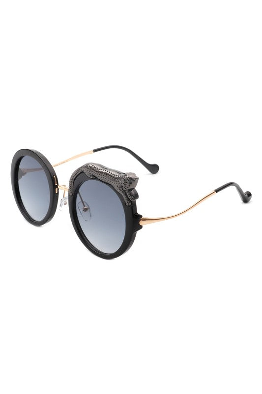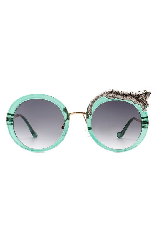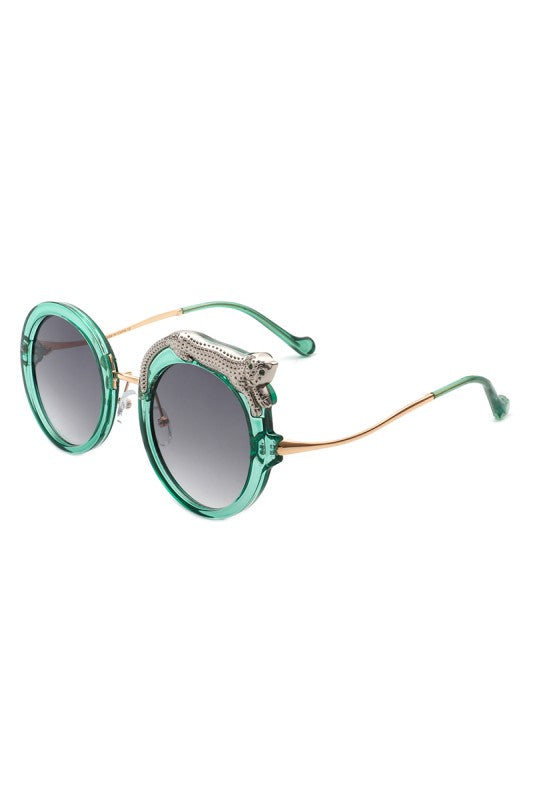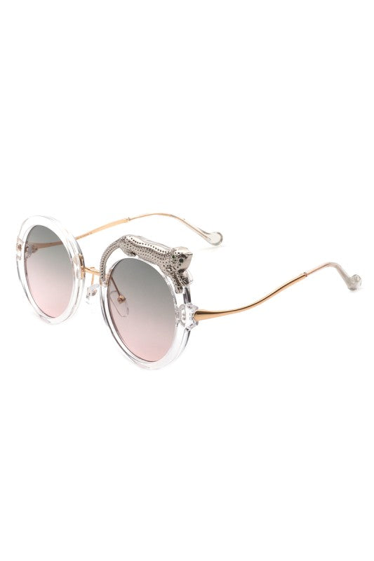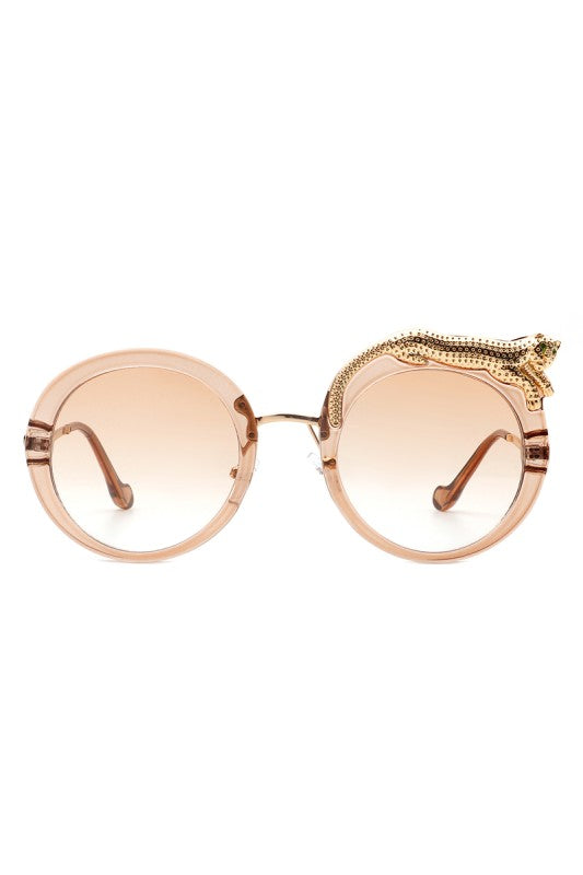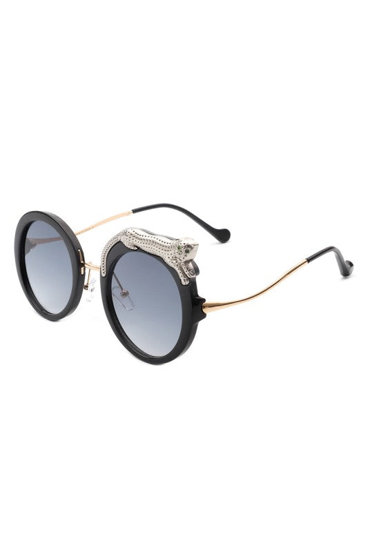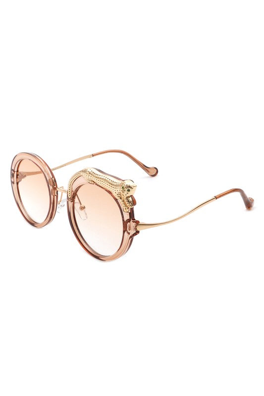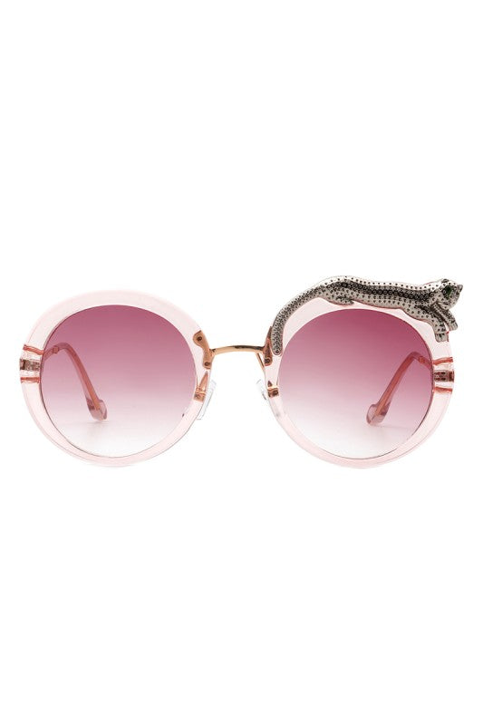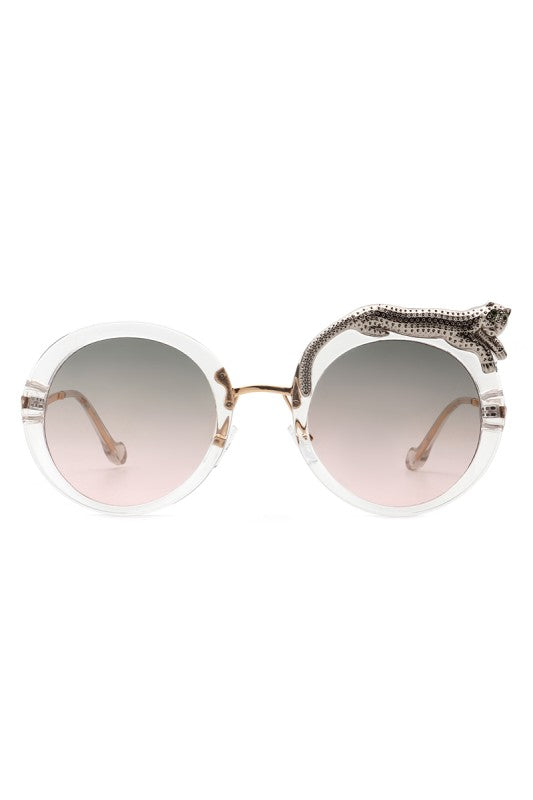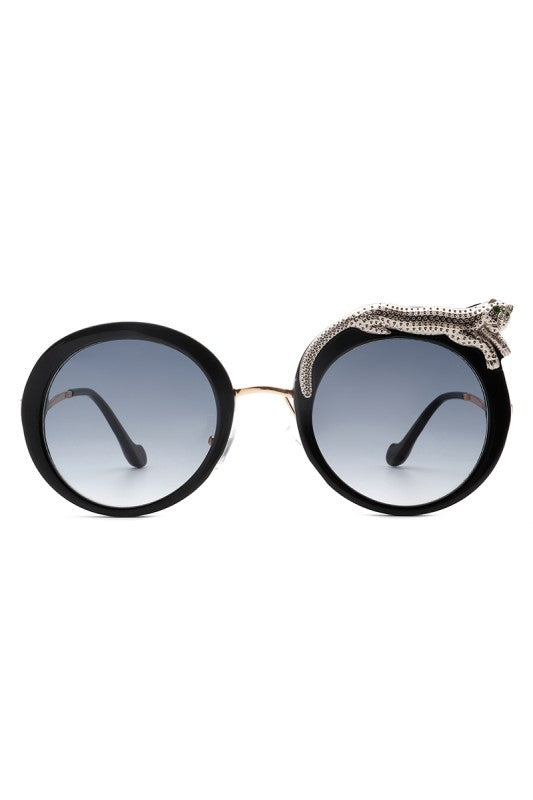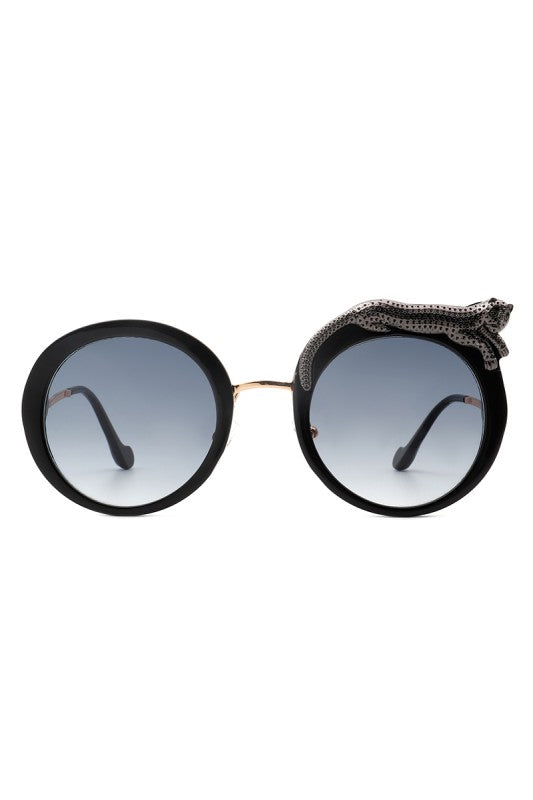 Round oversized sunglasses featuring a striking crystal snake detail on the frame, blending bold luxury with playful high-fashion style. Perfect for making a statement while keeping an elegant edge.