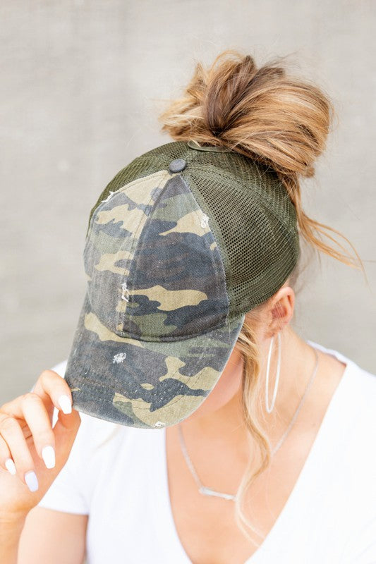 PonyFlo CAMO Distressed Messy Bun Cap Hat