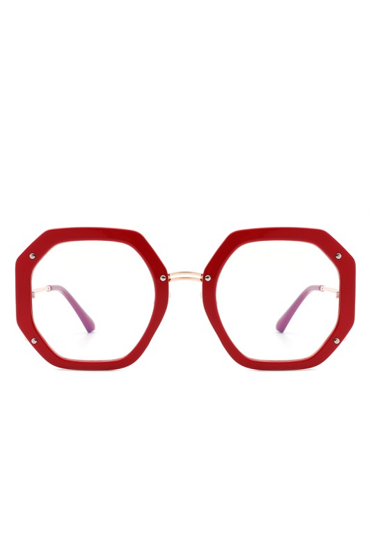 Fashion-forward geometric blue light blocker eyeglass frames with bold octagon shapes and sleek metal temples, combining retro charm with a modern artistic edge.